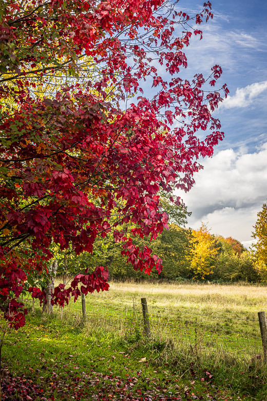 Autumnal weather in the Welsh Marches can be disappointing, so when the sun came out and the leaves had started to take on the yellow and orange hues, I grabbed the camera for a very short walk along our field and our neighbour’s woodland.