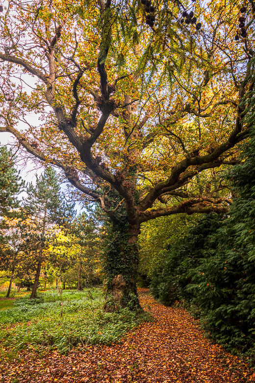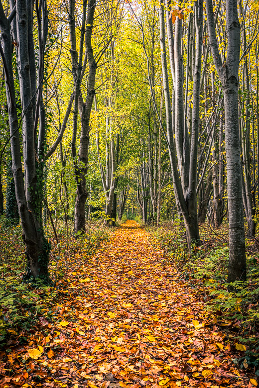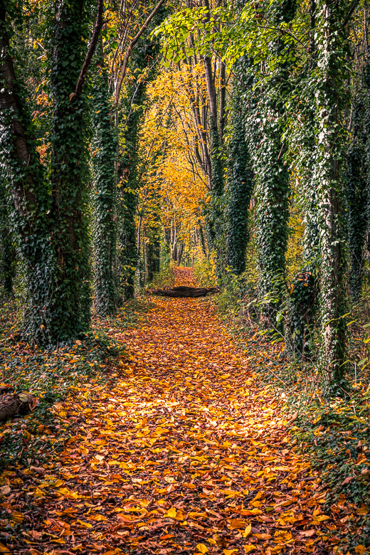 Here I have crossed into David and Row’s woodland. The walks were covered in a mat of yellow, orange and red leaves, with the sun breaking through the lime trees (linden trees) here and there. On the left picture the lime trees are covered in ivy