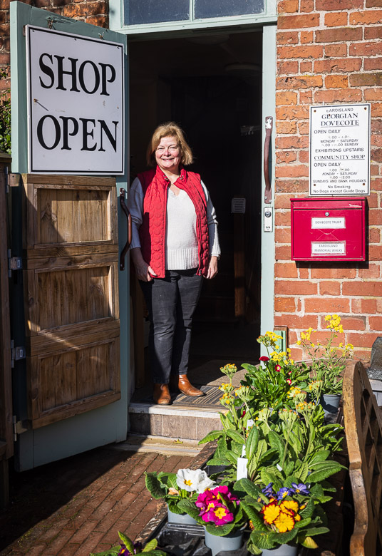 The left image shows the end of the dovecote, now converted to the village shop. And in the right image, Helen, one of the persons manning the shop on a voluntary basis, is at the door. The waterway is the canal running next to the river.