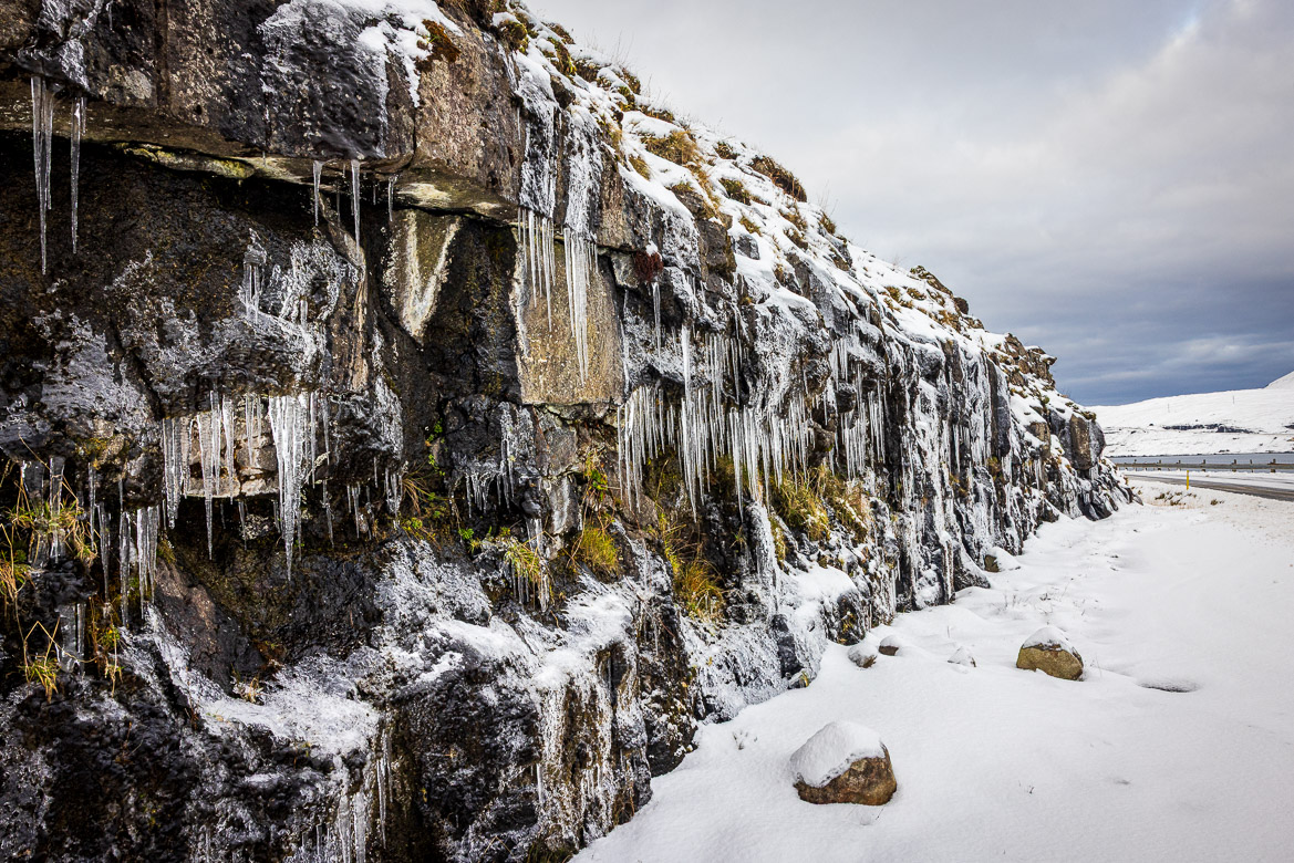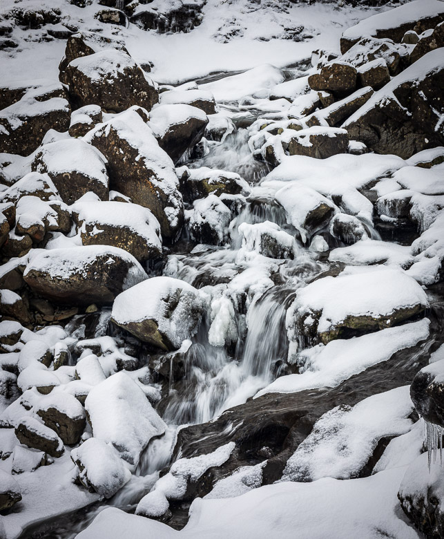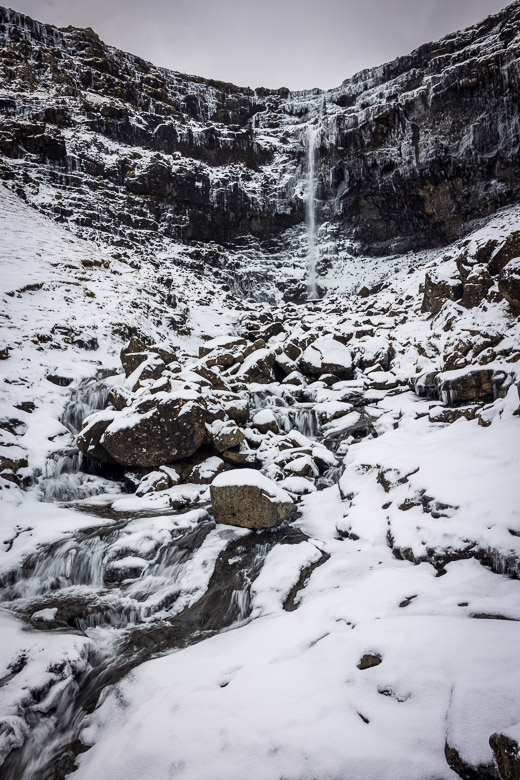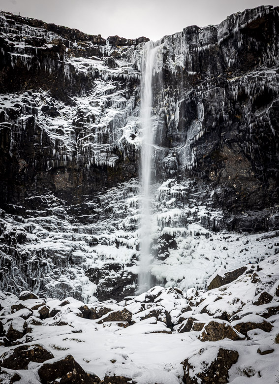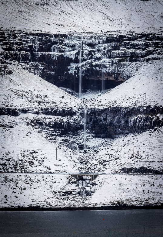 When we arrived to the Faroes it had snowed and was still snowing on our arrival. We used the first day to photograph the waterfall with the snow and then came back a few days later to get another view of it. The character was quite different at the two occasions.