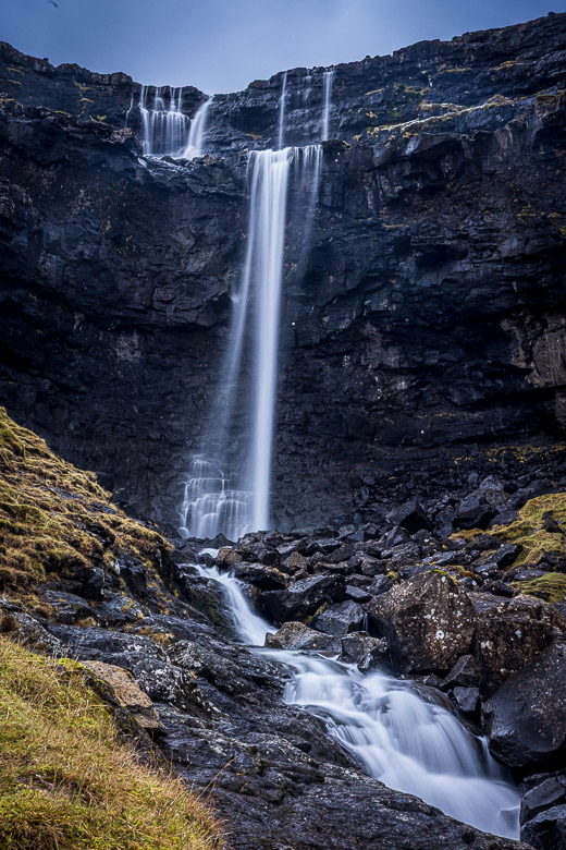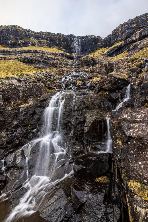 Fossa Waterfall drops in two distinct levels down to the sea on Streymoy Island. It is the tallest waterfall in the Faroes and the white water contrasts against the dark basalt cliffs surrounding it. The steps are created by the hard volcanic basalt formed around 50 – 60 million years ago. In between the layers of hard basalt are softer volcanic ash, and then comes another hard layer and so on. This creates the step effect that you can see in many of the waterfalls I have photographed on the islands.