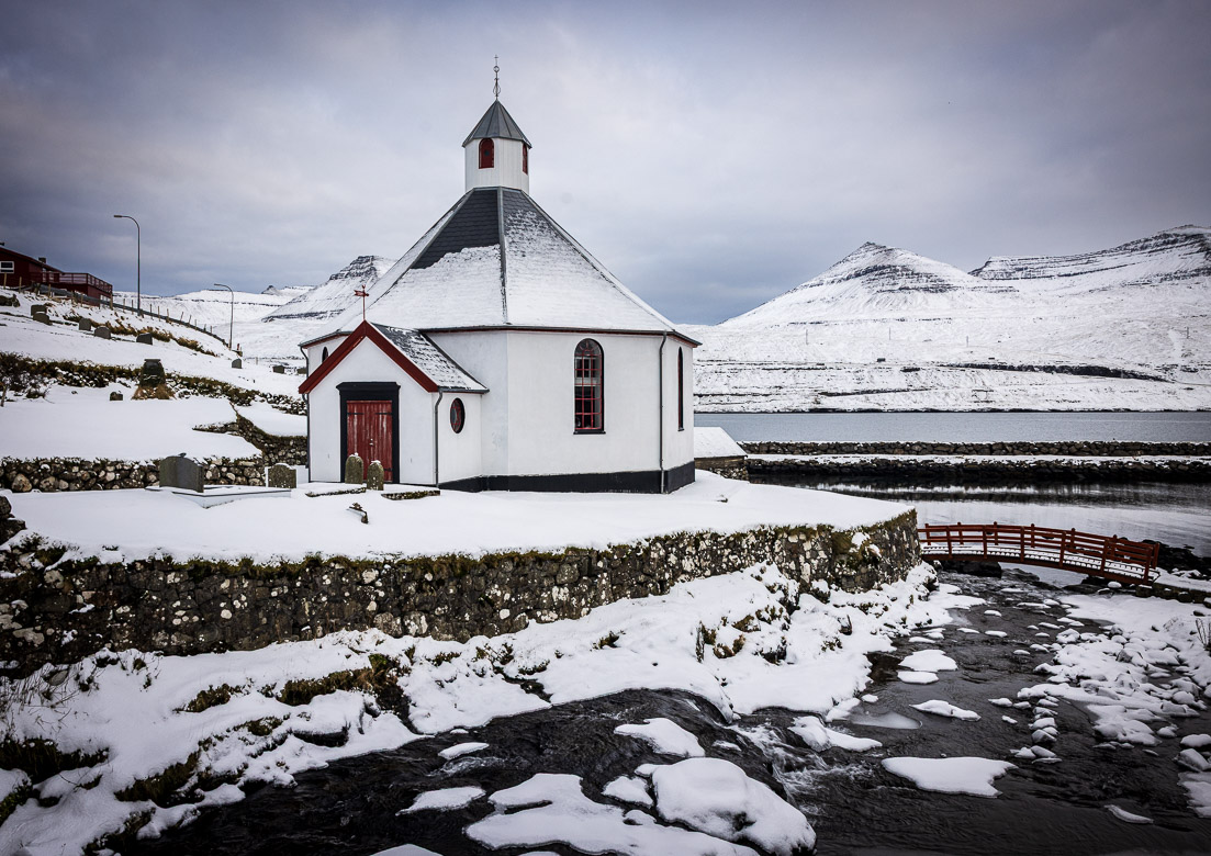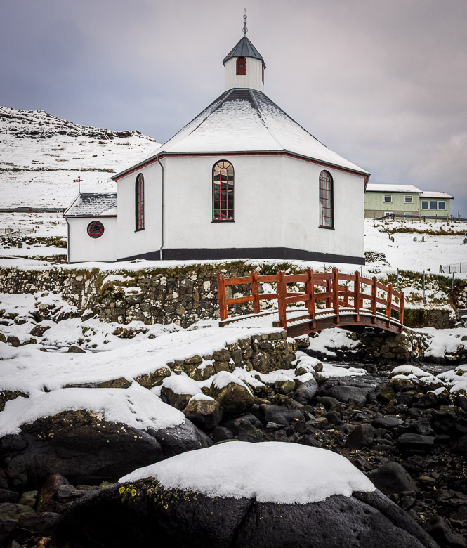 We drove north from Torshavn on Streymoy along its eastern coast. Next to us on one side the mountains were towering up and on the other we had a sliver of the Atlantic between Streymoy and Eysturoy. Towards the north of the island we came to the village of Haldórsvik, with its unique octagonal church.