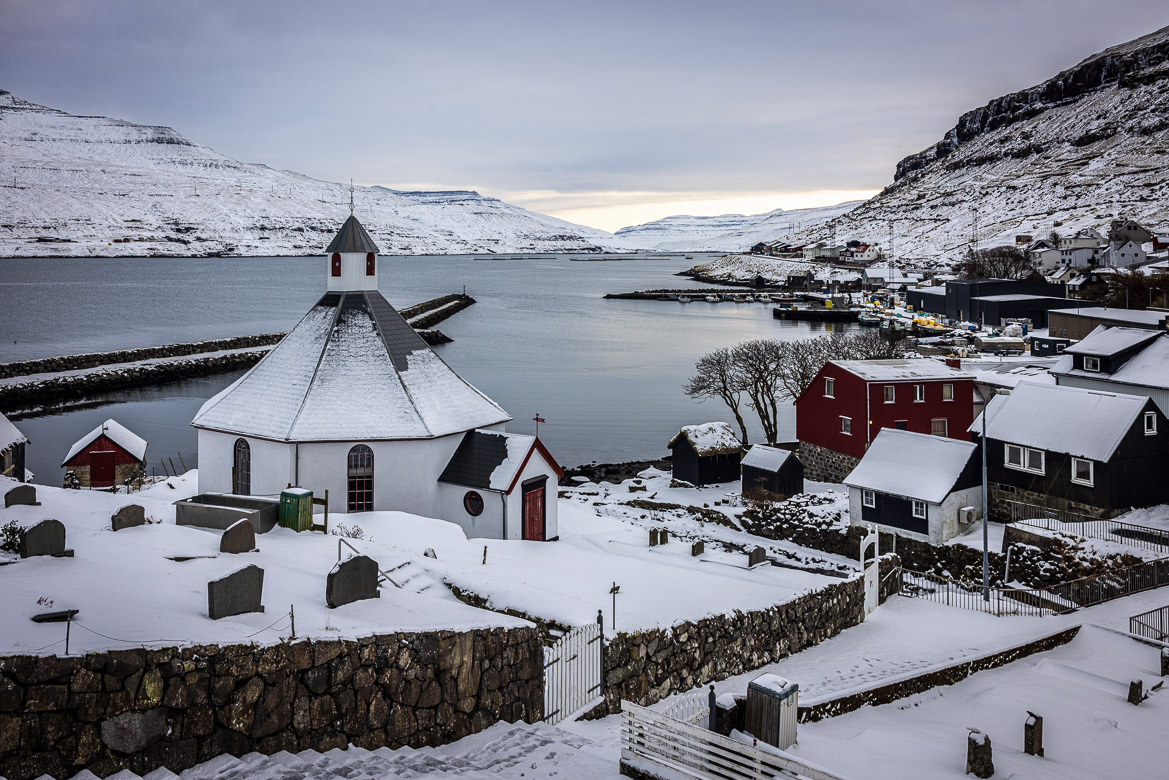 We drove north from Torshavn on Streymoy along its eastern coast. Next to us on one side the mountains were towering up and on the other we had a sliver of the Atlantic between Streymoy and Eysturoy. Towards the north of the island we came to the village of Haldórsvik, with its unique octagonal church.