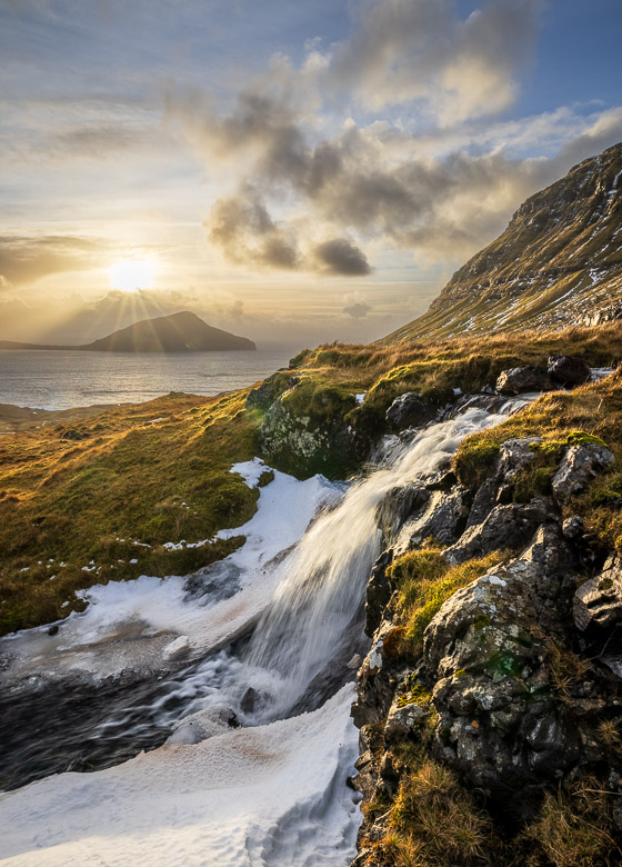 A little stream caught from two very different perspectives. The left image is looking back towards the mountain towering behind, whereas the right image is captured at the top waterfall of the left image looking out towards Koltur with the sun rays shining through the water cascades.