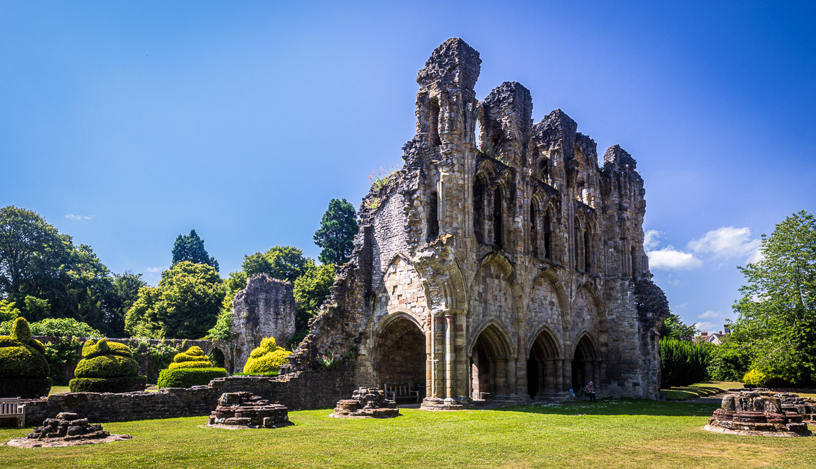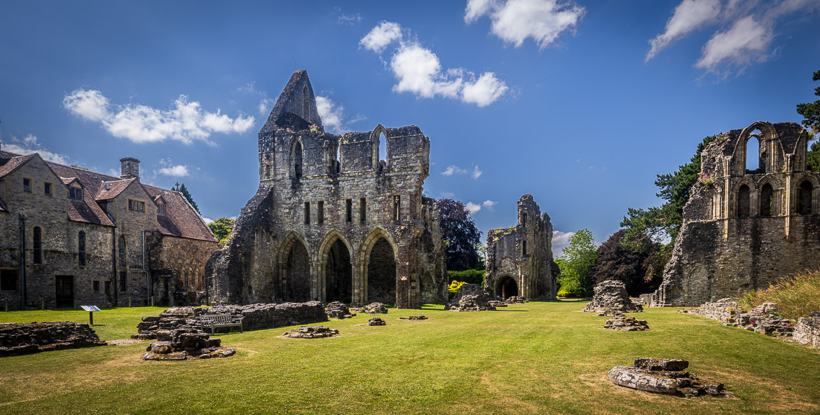 Wenlock Priory. The photo is from the cloister garden with the ruins of part of the abbey church, more precisely the south side of the nave standing to the left of the image and the remains of the south transept in the middle. The the right of that are the remains of the remarkable chapter house and to the right are the former prior’s lodgings.