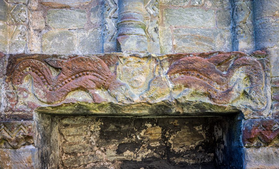 Lintel in the chapter house above the doorway to the Prior’s lodgings, probably originally situated at another position. It is Romanesque and depicts a semi-human mask with pointed ears set in between two serpents with heads at both ends. The creatures that can move both ways (with two heads each at opposite directions) could be a reference to the destiny of the soul after death – moving towards heaven or hell.