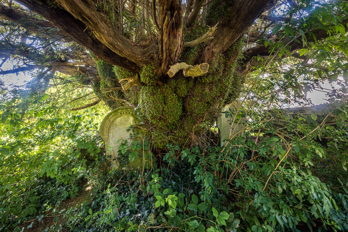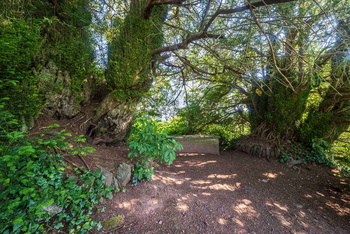 The largest tree is around 20 metres across and is split in two distinct halves. The second, smaller half is genetically identical but may herald from a branch of the original tree. Yew trees can sprout a new trunk from a branch that touches the ground. . In that sense the yew tree symbolises both death and resurrection. The death because the whole tree is poisonous. And the resurrection because a new, but genetically identical tree can sprout from a branch that becomes rooted to the ground.